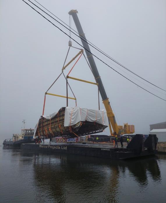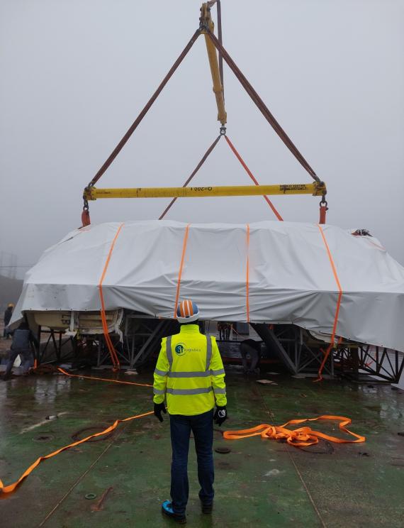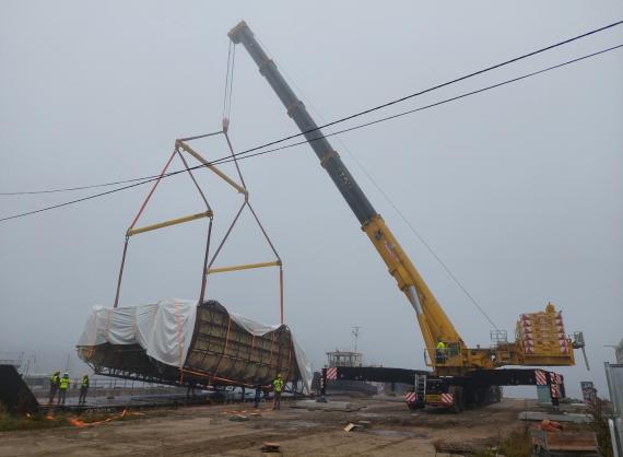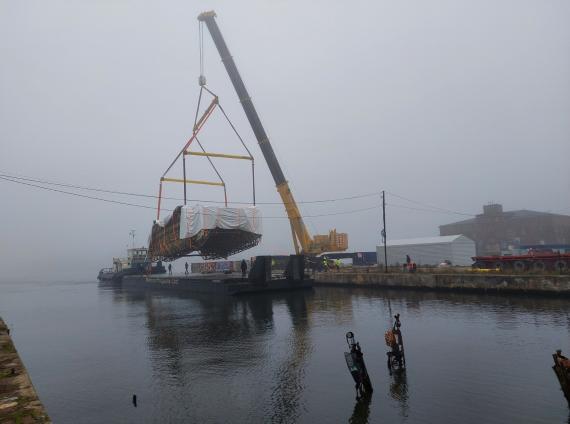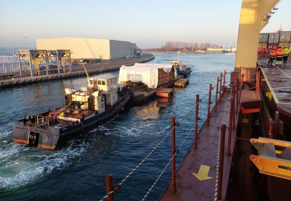 The loading of the cargo onto the barge was performed with a mobile heavy crane starting at 06:00 in the morning, followed by barge transportation to the seaport, where the heavy yacht moulding module was directly transshipped from the barge onto the ocean breakbulk vessel using the vessel's heavy-lift cranes. All operations were successfully completed by around 22:00 in the evening, allowing the vessel to sail the same day.