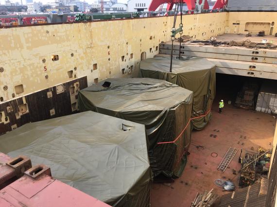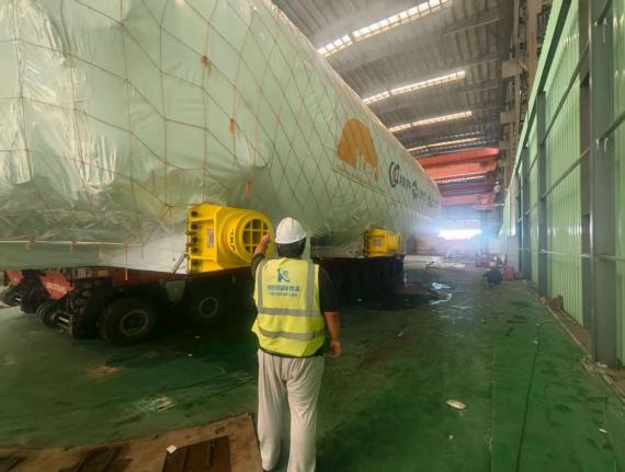 The main body of the cargo and largest component weighs 313tns and measures 21.4 x 10.5 x 6.0m. It was loaded and delivered with SPMTs from the factory to the terminal in Zhangjiagang, 3km away, before being loaded on a breakbulk vessel to France.