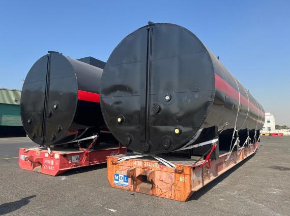 The bitumen storage tanks, each measuring 13.8 x 3.7 x 3.7m and weighing 25mtn, required meticulous planning and specialised handling. The cargo was safely positioned, lashed, and secured onto MAFI trailers under close supervision and coordination with all relevant stakeholders, including port authorities, carriers, and handling teams.
